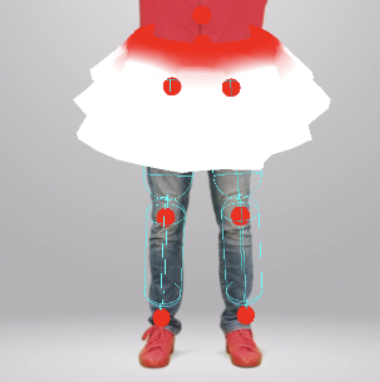 Now, take a look at the Cloth Simulation Tutu object. With the Debug Material you can see that the red vertices on the tutu mesh are binding to the hip binding point. With repulsion and collider enabled, the tutu collides with the legs.