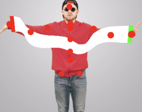 The setup is similar to the other 3D body tracking example. Click on the Cloth Simulation Jacket object to see the difference. You’ll see red vertices are binding to the neck binding point, yellow vertices are binding to the left arm binding point, and green vertices are binding to the right arm binding point.