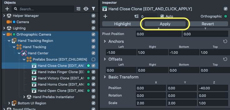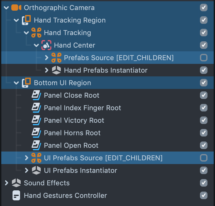 You can find these objects in Orthographic Camera > Hand Tracking Region > Hand Tracking > Prefabs Source [EDIT_CHILDREN] and Orthographic Camera > Bottom UI Region > UI Prefabs Source [EDIT_CHILDREN] respectively.