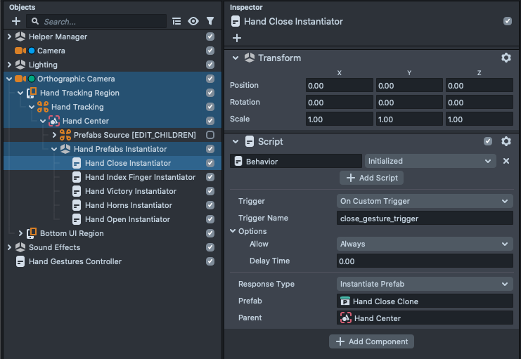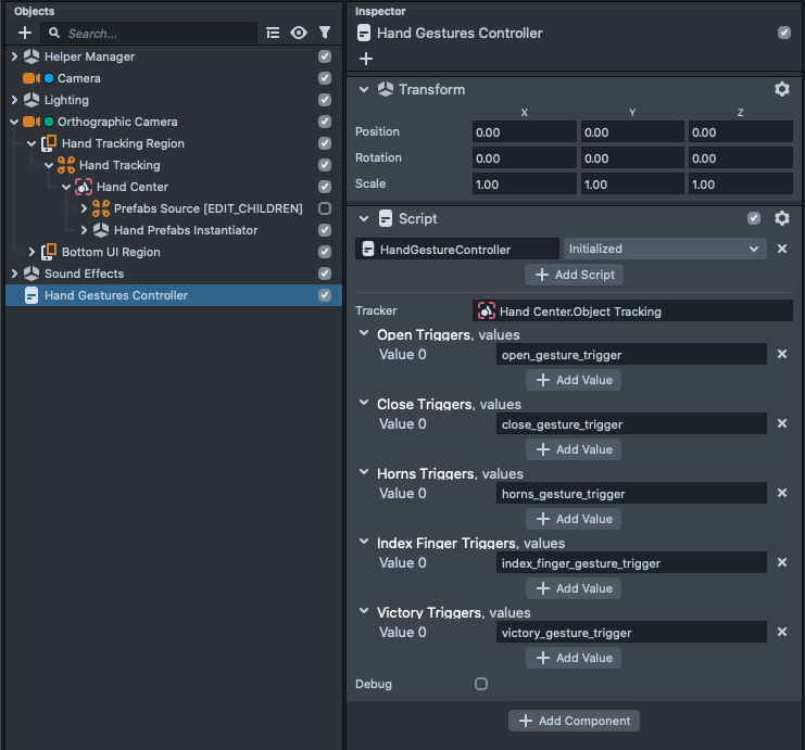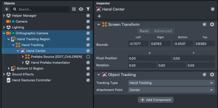 The Hand Tracking part is managed by the Object Tracking component, which is attached to the Orthographic Camera > Hand Tracking Region > Hand Tracking > Hand Center. In addition to tracking the hand, this component can also look for hand gestures.