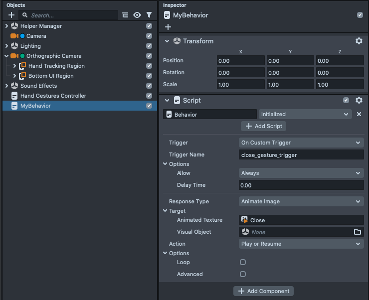 We can use the Behavior script to respond to the hand gestures events. This template provides two examples of using the Behavior script to respond to detection of a hand gesture:
