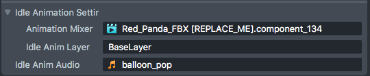 Idle Anim Layer (string)- The name of the anim layer that should be played for the idle animation. The anim layer name is configured in your external 3D editor. The anim layer name is also listed in the object's Animation Mixer component -