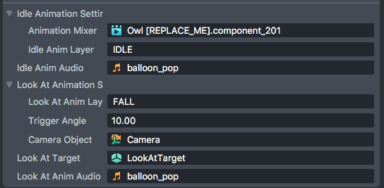 Look At Anim Audio (Asset.AudioTrackAsset)- A reference to an Audio Track Asset in your resources. If set, the inputted audio will play alongside your animation when the object is looked at