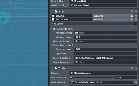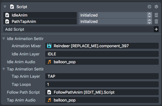 These layers can be used to define the additional animations that will play on interaction. For the Interactive Path Template we can use up to four animations to expand on the behavior of found in the Interactive Tap Template. First, set the Idle Anim Layer field to the layer name of your looping idle animation. Then, set the Tap Anim Layer field to the layer name of your tap animation which will play when the object is tapped.