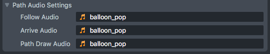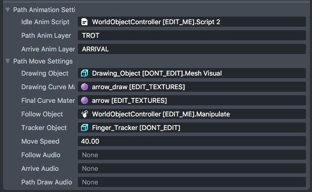 Drawing Object (MeshVisual)- A reference to the mesh that will be used to draw the path the object will move alongDrawing Curve Mat (Material)- This is the material that will be applied to the Drawing Object while a user is actively drawing the pathFinal Curve Mat (Material)- This is the material that will be applied to the Drawing Object when the path is complete and the object is moving along that pathFollow Object (SceneObject)- This is the object that will move along the path and should be the WorldObjectController SceneObjectTracker Object (SceneObject)- This is an invisible object that is tracked to the users finger and helps derive position and orientation of stroke along pathMove Speed (float)- This is how fast the object will move along the pathFollow Audio (AudioTrackAsset)- A reference to an Audio Track Asset in resources. This is a looping sound that plays while the character or object is moving along the pathArrive Audio (AudioTrackAsset)**-**A reference to an Audio Track Asset in resources. This is a non-looping sound that plays when the character or object reaches the end of the pathPath Draw Audio (AudioTrackAsset)**-**A reference to an Audio Track Asset in resources. This is a non-looping sound that plays each time a drawing arrow is placed on the surface by the users finger