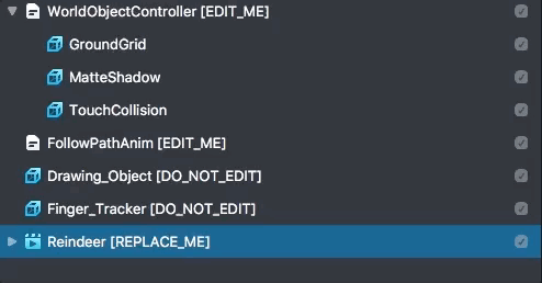 The object layout for the Interactive Path Template has a similar layout to the Interactive Tap Template with a few additional objects. The Idle animation and the Tap animation are still controlled as you would expect from the Tap Template which can be found on the WorldObjectController.