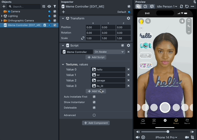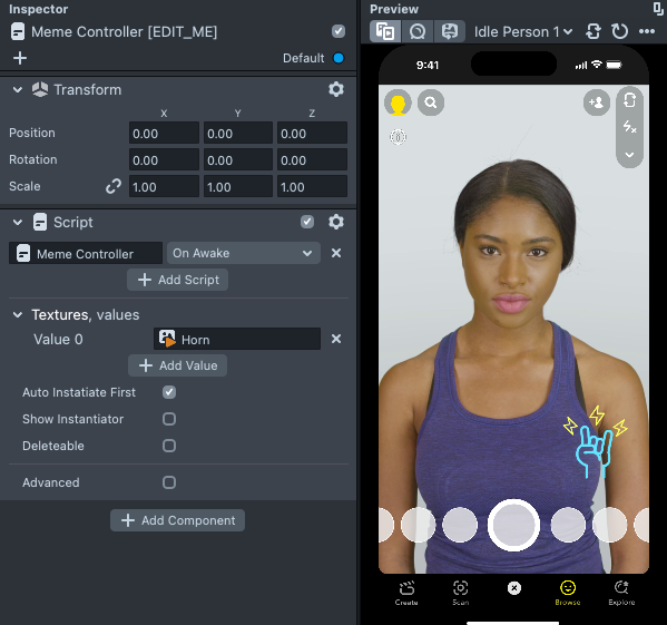 The Meme Sticker Template allows you to turn any image, gif, or video into a sticker Lens that allows Snapchatters to add, position, scale 2D textures around the screen.