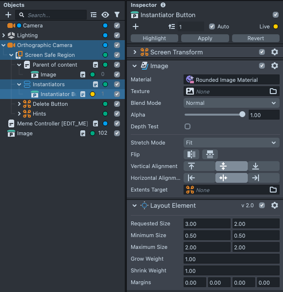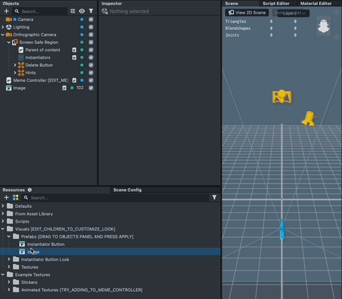 The Meme Sticker template works by instantiating Prefab: whether it be the prefab to create the instantiator buttons, or the sticker itself. You can modify the prefabs to additionally change how your Lens looks.