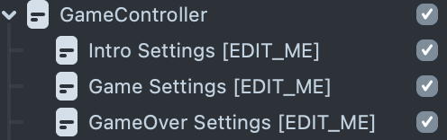 With Game Controller, you can set up the intro scene, game scene and gameover scene.