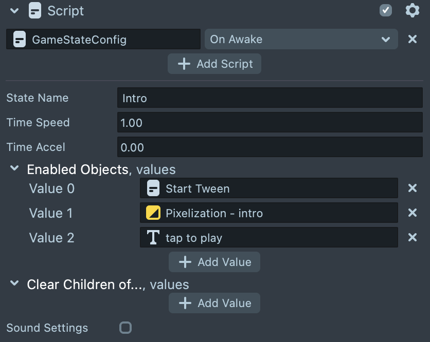 With Game State Config, you can modify the settings for each scene. Such as enable objects or clear children of objects, modify the sound settings.