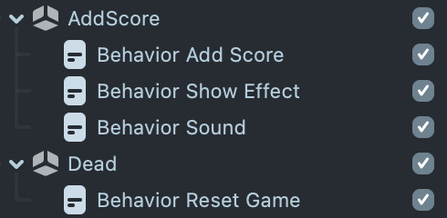 With Behavior Scripts, you can trigger Add Score or Dead effects. You can find all the behavior scripts under Add Score object and Dead object.