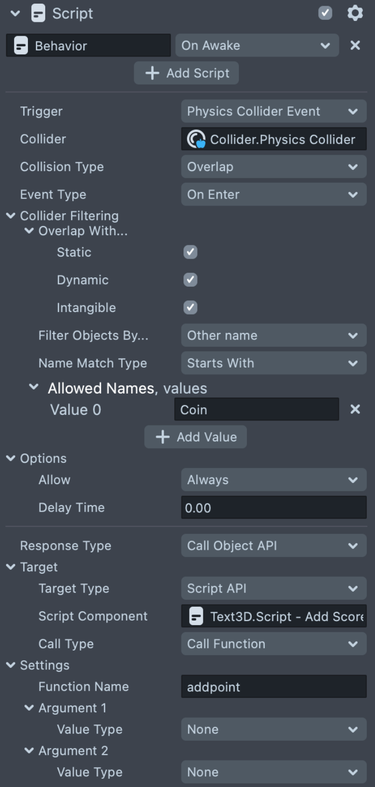 With the Behavior script, you can use Physics Collider Event as the trigger and filter the Scene Object’s name. Based on the name, you can trigger Add Score or Dead effects.