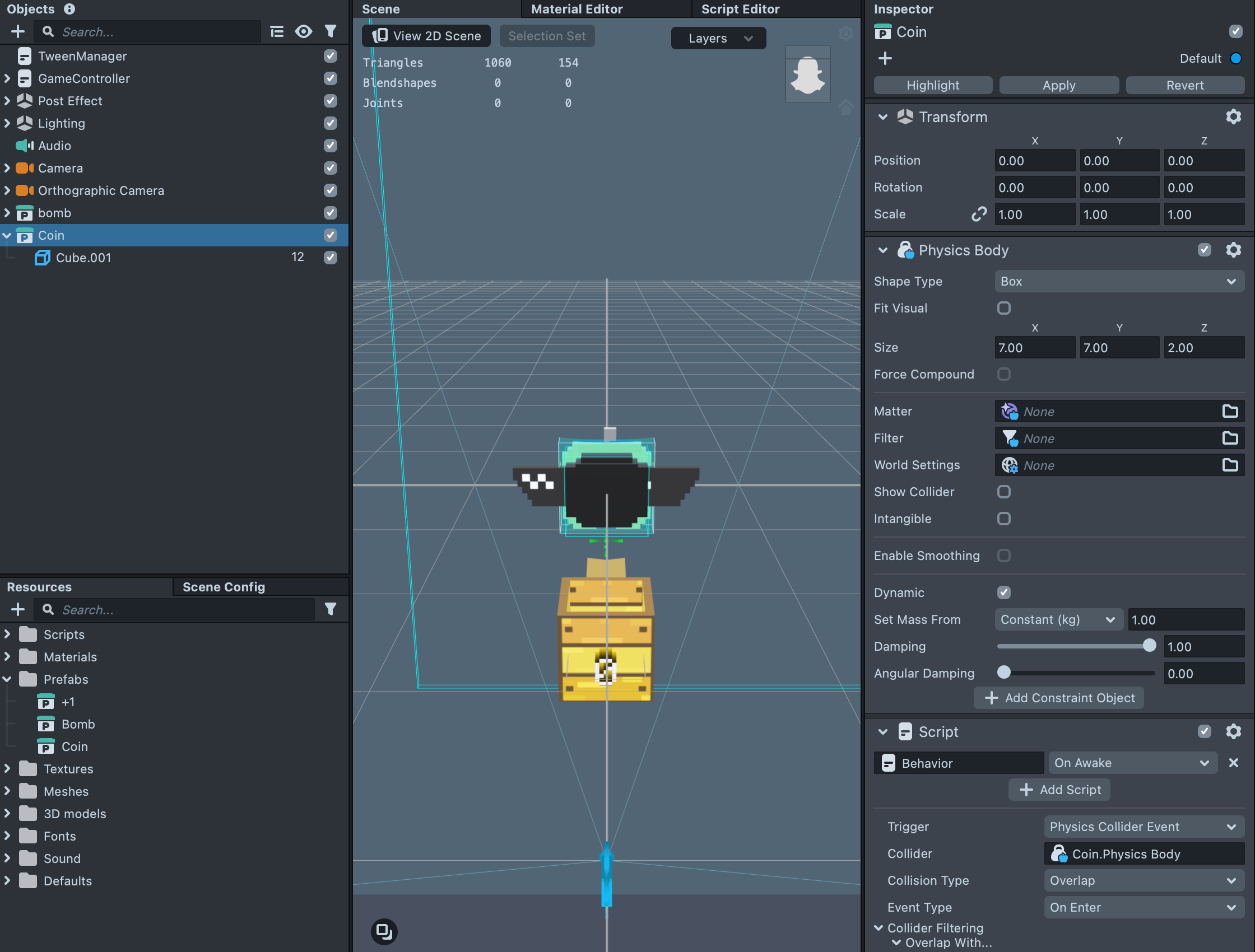 You can find Bomb and Coin Prefab in the Resources panel. Drag the prefabs to the Objects panel to check out the setup.