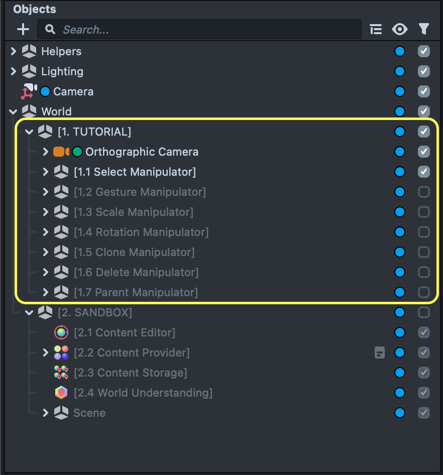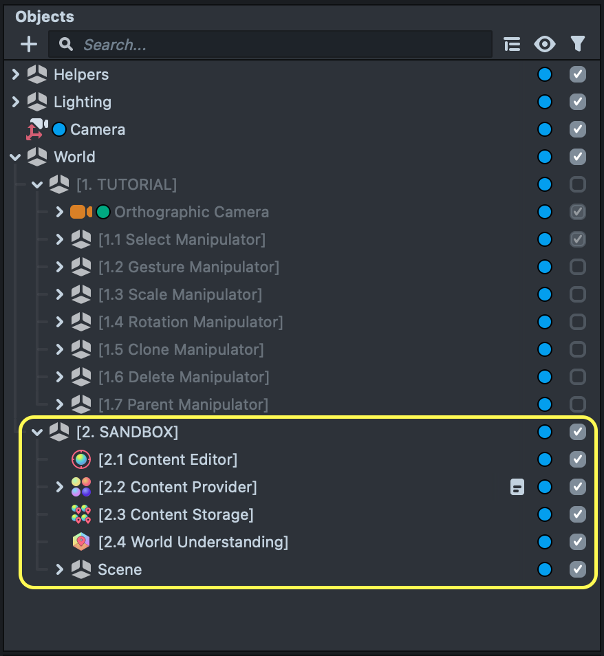 Physics Lab Template provides you with a ready-to-go setup of the Content Editor Tools. Let’s take a closer look at every component’s place and function in the Lens Studio project.