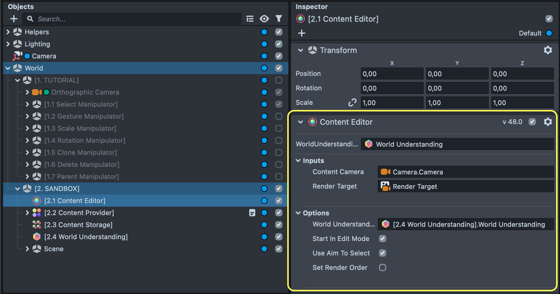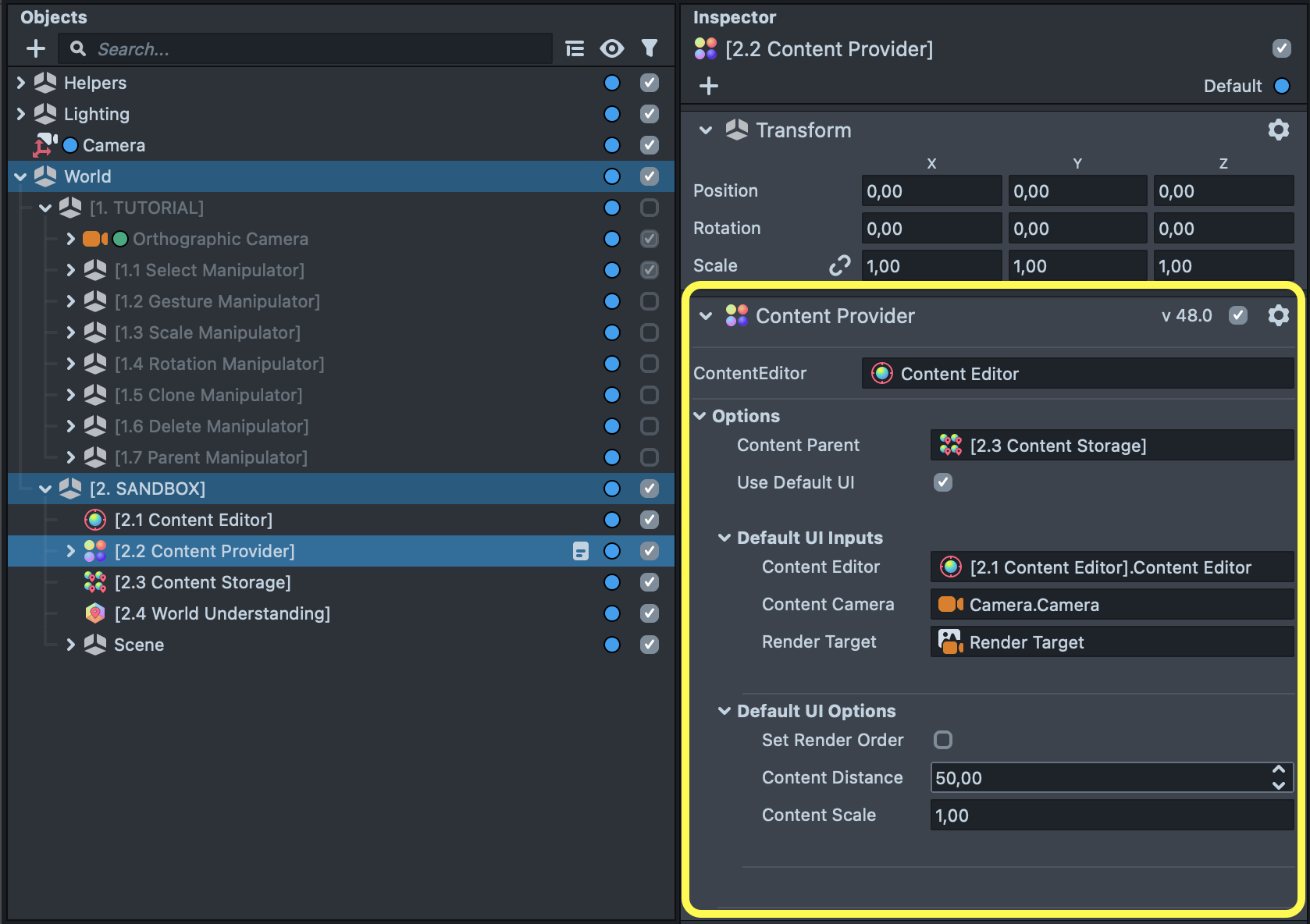 - Content Provider – the inputs an instance of the Content Provider component in your scene.custom component, (Uit is used to track newly spawned content that needs to be stored.)and persist them if needed.