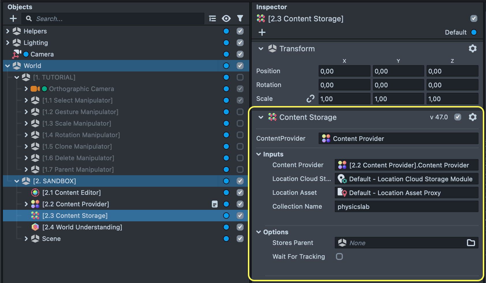 - Stores Parent – the inputs a Scene Object to use, which will be used as a parent for location store Scene Objects. Typically this input is left empty or the same as the provided with a parent Scene Object of your Content Editor Tools scene.