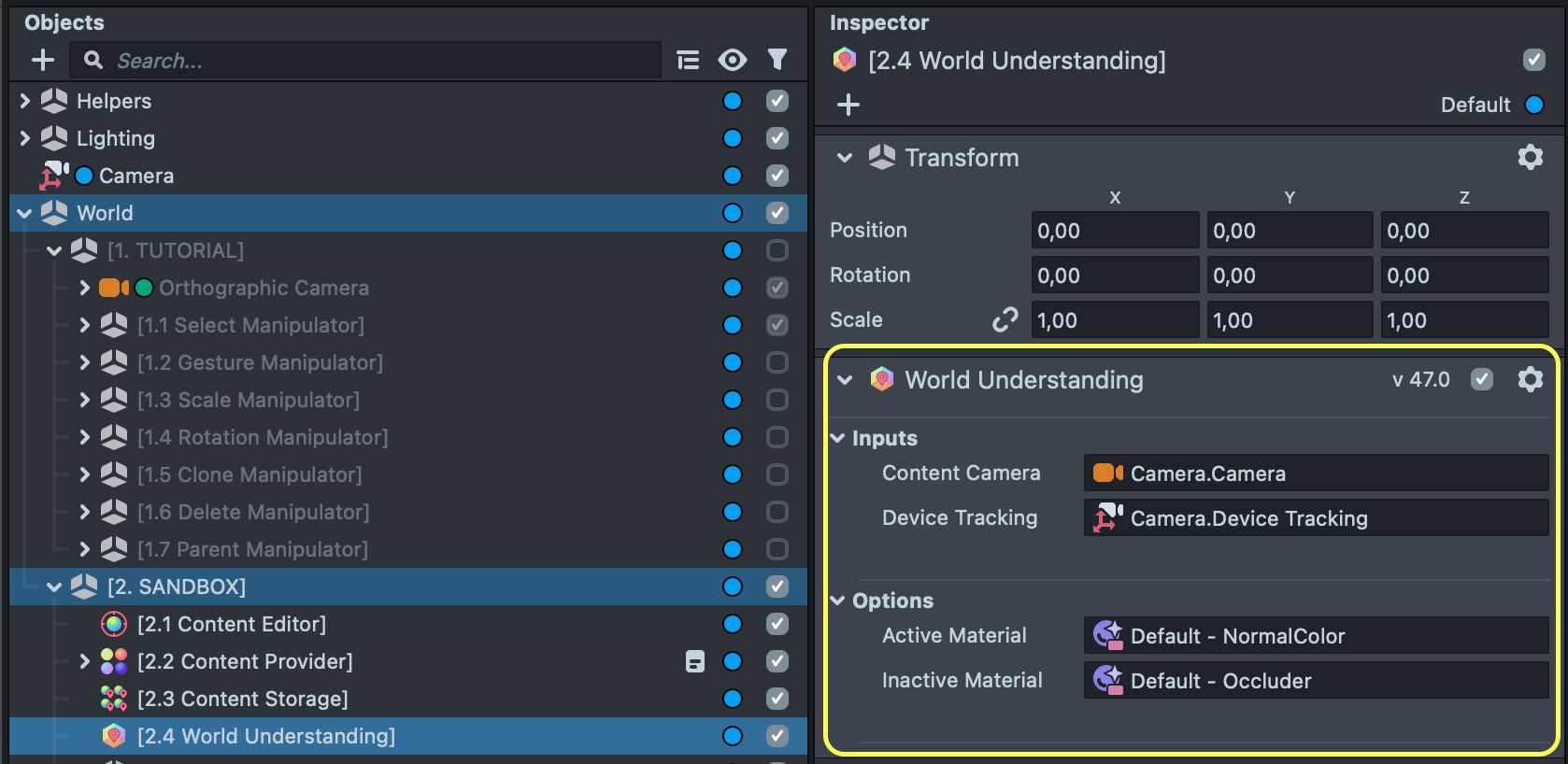 - Device Tracking – the inputs a Device Tracking component instance in your Scene., which is u(Used to initialize tracking capabilities of the World Understanding.)