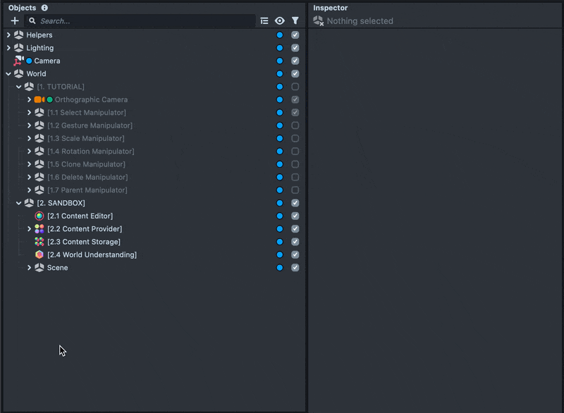 When you complete the last Tutorial puzzle, you will enter the Sandbox. The Sandbox starts with an empty scene. You can add 3D assets to the Lens from the Content Provider menu and edit the 3D assets using the same Content Editor Manipulators from the Tutorial.