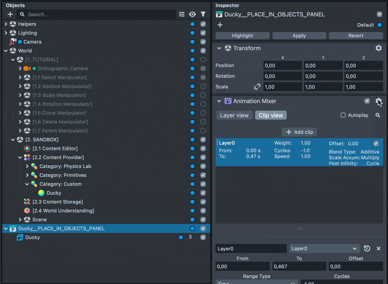 Start the Sandbox in the preview. Hit the Plus button to open the Content Provider’s default UI menu. Press the Ducky icon to add your Ducky asset to the scene. Edit the Ducky using the Content Editor Tools. When you reset the lens, you should see the Ducky persist how you left it thanks to Content Storage.