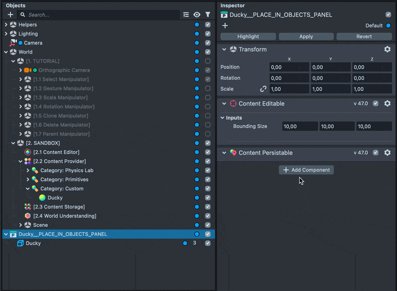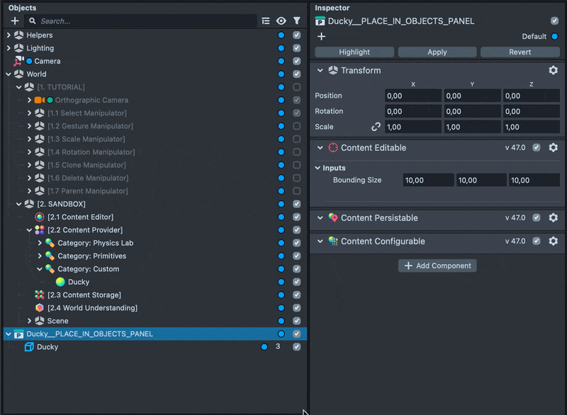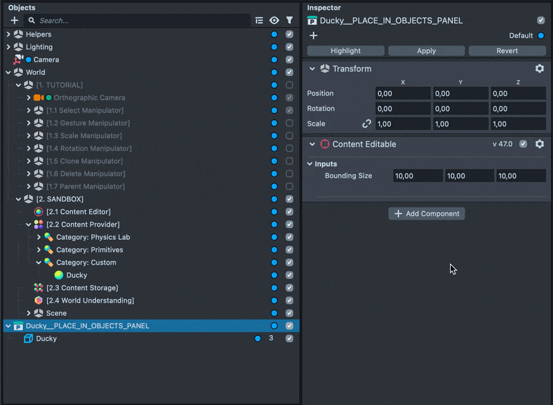 A Content Editable component is required for content to use the Content Editor Tools (Select, Rotate, etc.) Let’s add a Content Editable component to the Ducky Object Prefab. Adjust the Bounding Size input in the Inspector so that the yellow box encapsulates your asset. Then hit “Apply”.