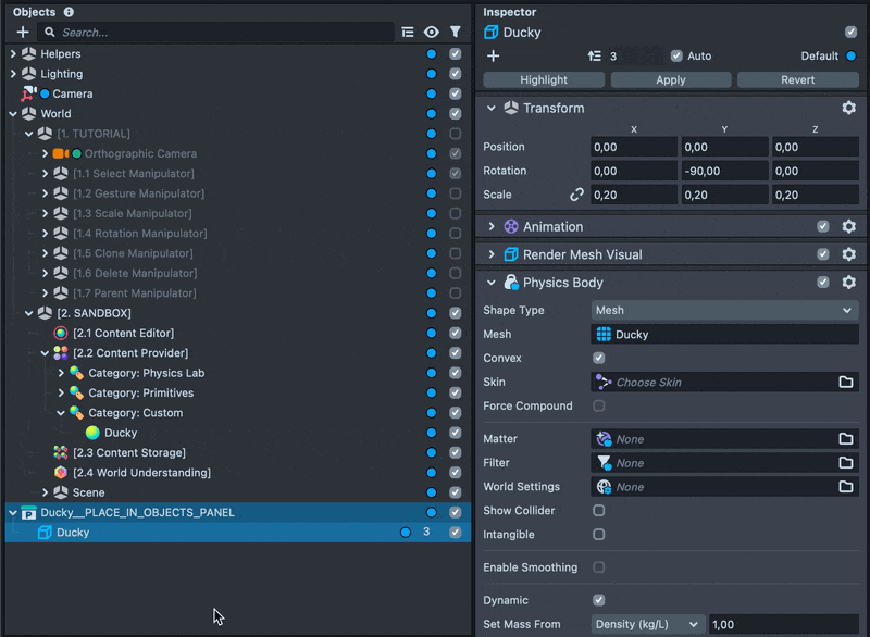 Now that our Ducky uses physics, we will add a Physics Configurable script to the Prefab, set its inputs, then hit Apply.