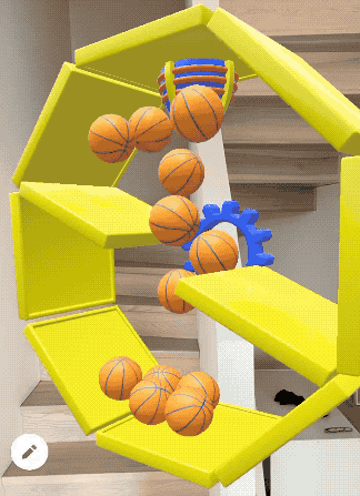 The “Rotate” puzzle introduces the Rotation Manipulator, which allows Snapchatters to rotate selected 3D assets within a Lens. The goal is to rotate the platforms so that the cannonballs go through the hoop. To complete this puzzle, tap to select a platform, then hold the Rotate button, and drag to adjust its rotation until the ball goes through the hoop.