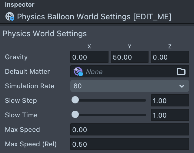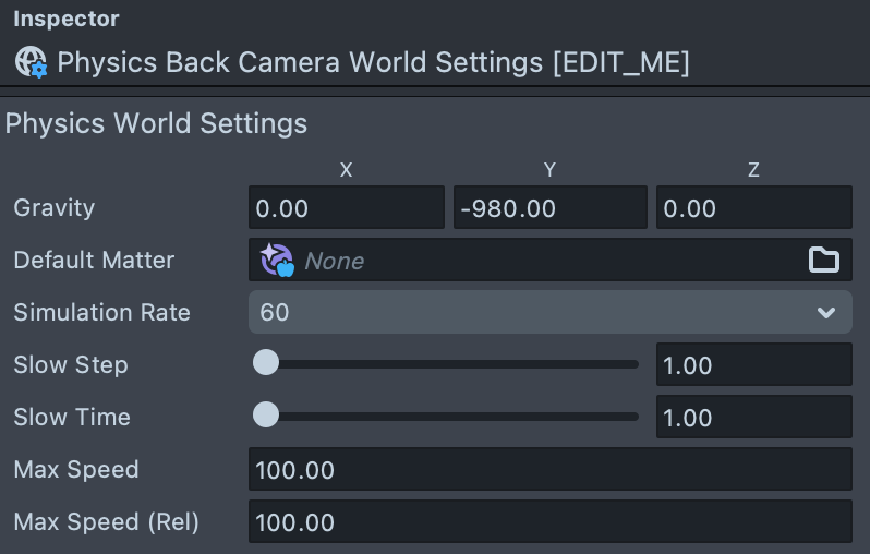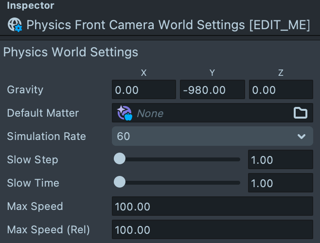 View the Physics Front Camera World Settings asset in the Physics World Settings folder under the Resources panel. Inside Physics Front Camera World Setting, you can set the following variables: