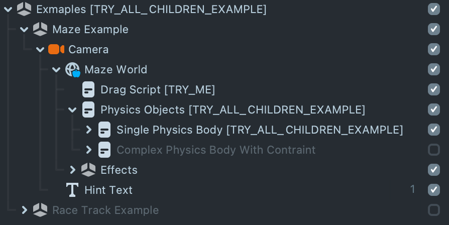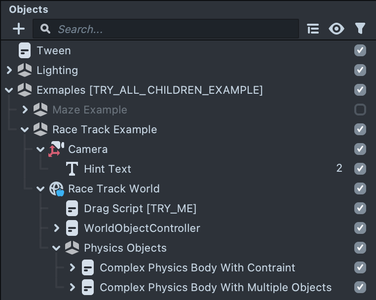 Click on Examples > Race Track Examples > Race Track World > Physics Objects > Complex Physics Body With Constraint and Complex Physics Body With Multiple Objects.