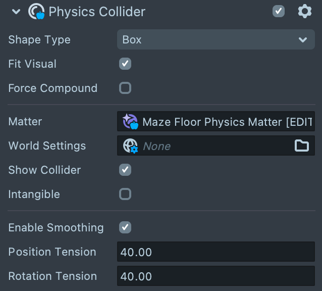 The maze object consists of many box colliders. Click on any collider in the mesh to find the Enable Smoothing option. The Enable Smoothing option smoothly interpolates between changes to help reduce noise. This template uses Enable Smoothing to reduce motion tracking noise.