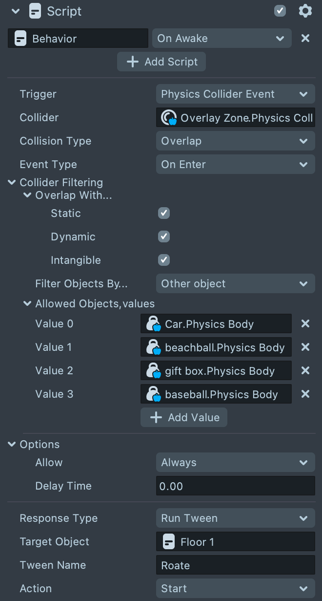 This example also uses Behavior scripts to handle Physics Collision Events and to change the Wall alpha to show the border of the Ground Collider and Wall Colliders.