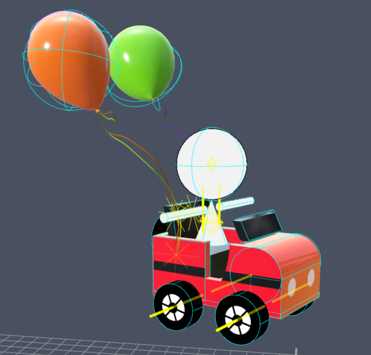 View the Balloons object located within the Car object. Balloons are generated using ObjectsLayout.js on the Awake Event.