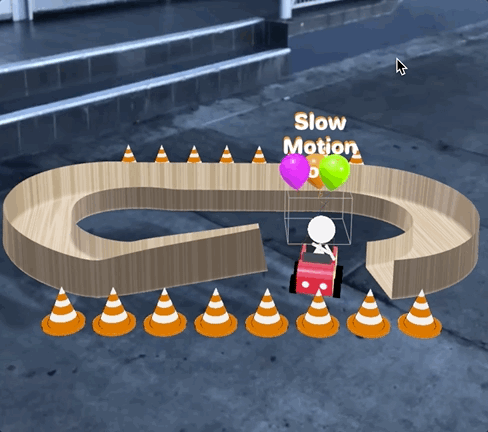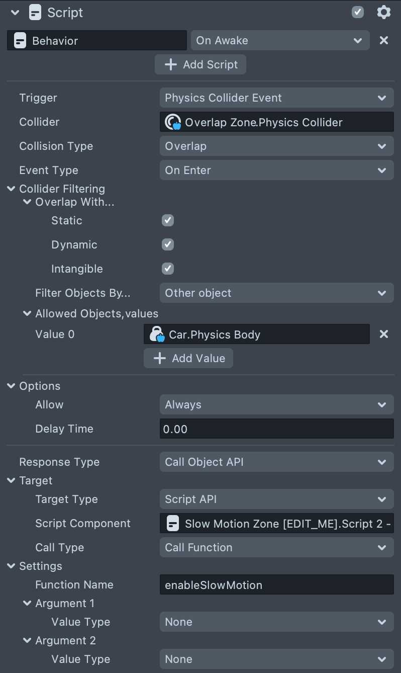 The Overlap Zone’s Behavior script calls the functions in SlowMotionSetting.js. Whenever the car passes through the Slow Motion Zone, the script triggers the slow motion effect. Modify the effect’s Slow Step and Slow Time attributes in the Physics Back Camera World Settings asset.