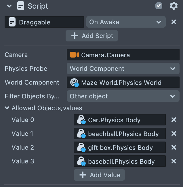 Click on Examples > Maze Example > Camera > Maze World > Physics Objects > Single Physics Body and Complex Physics Body With Constraint to see how this is set up.