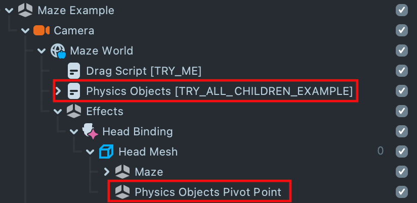 Once the physics simulation starts, the physic objects (scene objects with dynamic Physics Body components) move in world-space. The Head Binding effect allows the maze physics objects to track your head. Since you cannot make the Physics Object a child of the Head Binding, utilize the BindTransfrom script to bind the Physics Object's initial transform to a pivot point on the Head Binding object.