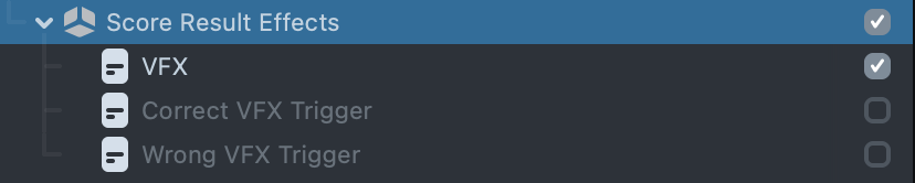 Find the attached Scene Objects under Quiz Result Effects -> Score Result Effects: Correct VFX Trigger Scene Object and Wrong VFX Trigger Scene Object. Behavior Scripts attached to the Scene Objects to trigger VFX when the answer is correct or wrong.