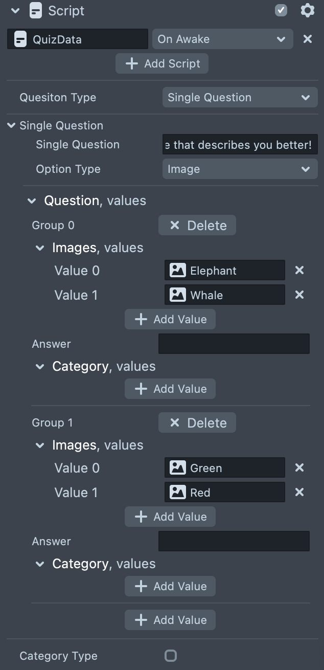 - Category: Users are typically presented with a set of questions, and each option belongs to a specific category. Based on the answers they choose, the user is then categorized into a certain category or multiple categories. E.g. Introvert or Extrovert.