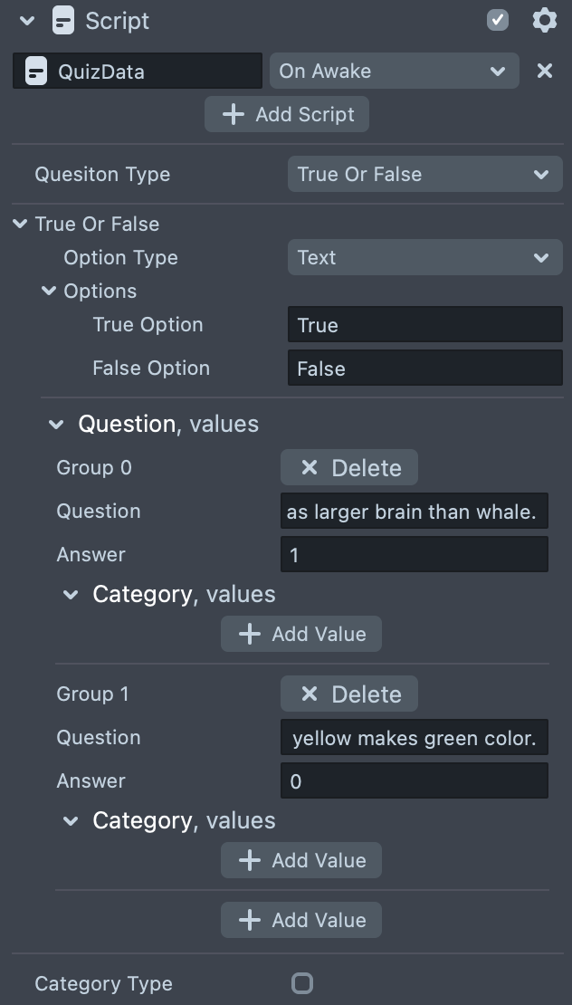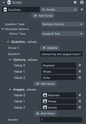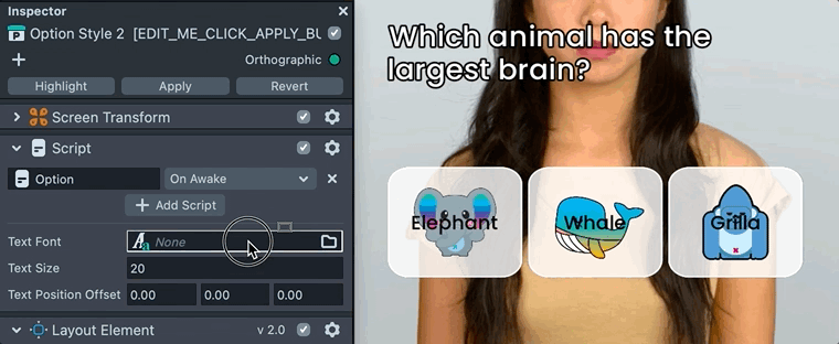 Option Button Prefab uses UI Button Custom Component. With additional Option Script, you can then set button font, size or offset the text. With Layout Element Custom Component, you can easily add multiple buttons to the Horizontal and Vertical Layout based on the Quiz Option Data and Option Type.