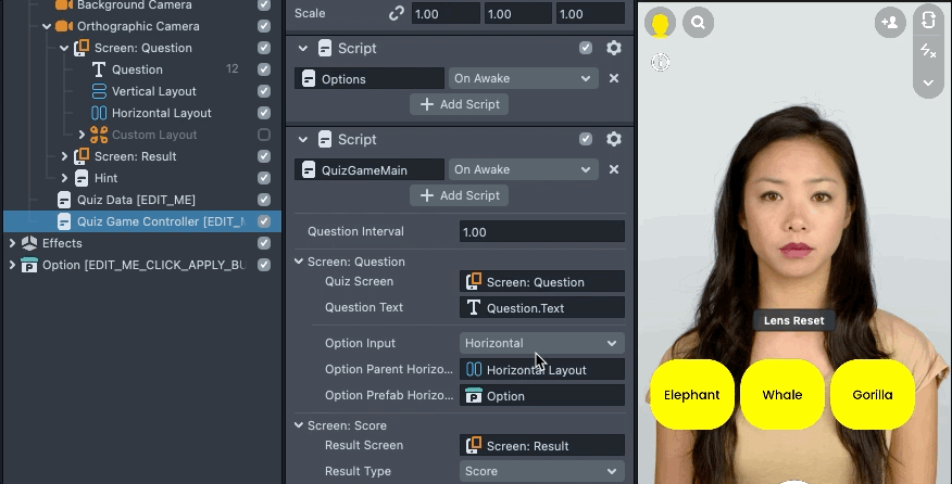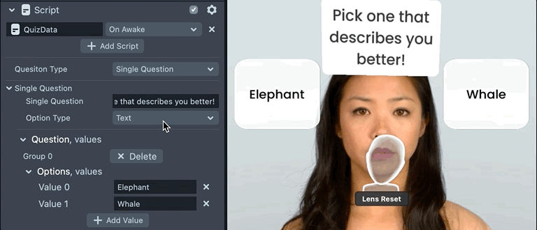 Quiz Lenses combine the interactivity of quizzes with personalized AR effects, creating a unique and engaging experience for users. Quiz Template allows you to design your own quizzes with specific questions, options, and AR Effects, all while incorporating interactive elements like tap and head tilt interaction.
