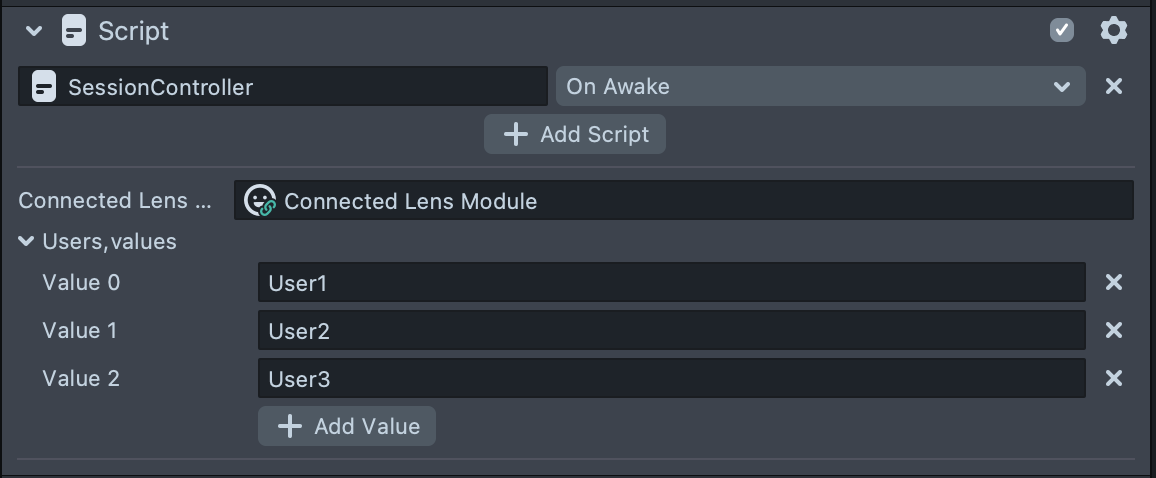 The SessionController also serves another useful purpose. It can imitate the user connections in Lens Studio, which can help you to develop the lens and handle events when users will be joining the session. By default it requests from the backend the local user ID and makes it available when ready, so you can easily use it for your needs.