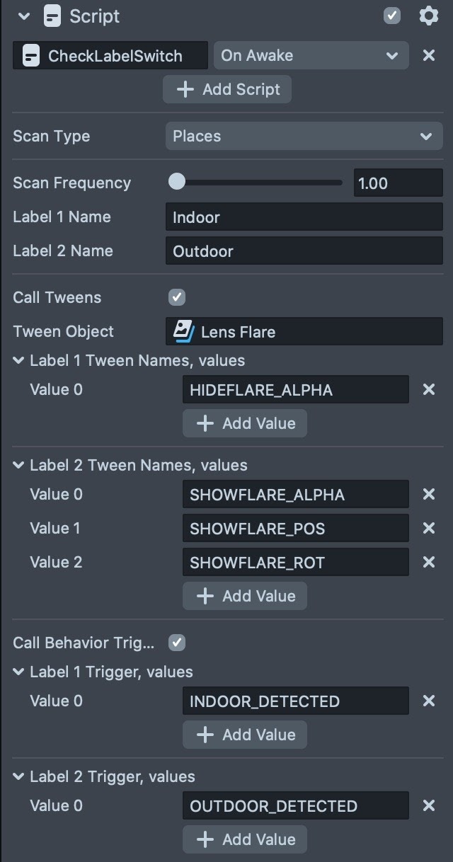 In the CheckLabelSwitch script, we can set up a tween response to run different tween animations on one object, in this case we’re running different tween animations on the Lens Flare object based on scanned result changing from ‘Indoor’ to ‘Outdoor’ and vice versa.