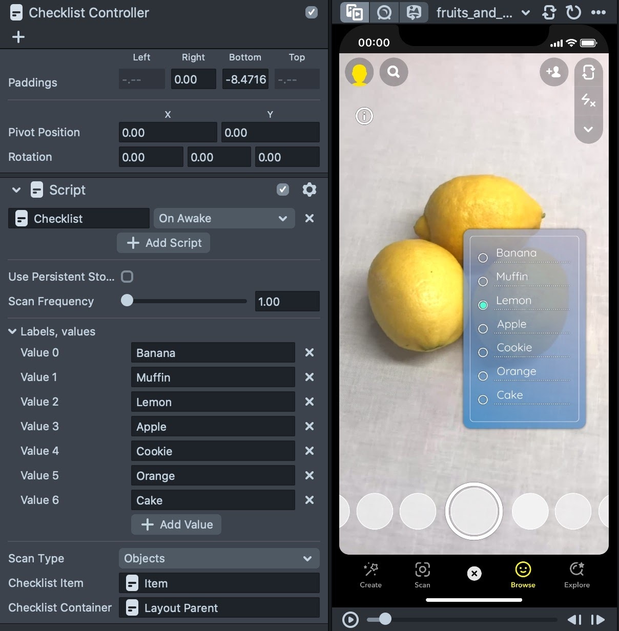 - Checklist: Check if objects in scene fits into the element populated in a checklist. In addition, it contains an example script that you can use to get started with your own Scan experience.