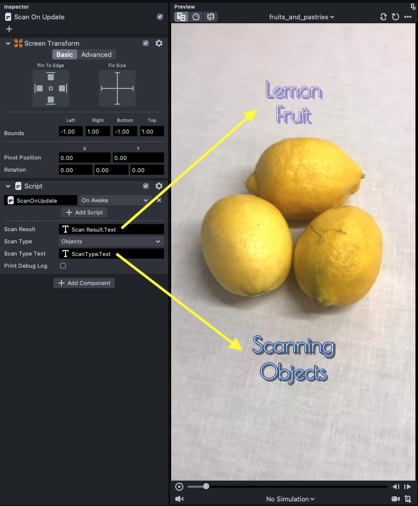 The Scan With Buttons example works similarly as Scan On Update, but instead of constantly scanning it will just scan a type of object when the corresponding button is pressed. Feel free to push this example to the Snapchat app to try it out with your phone to scan the objects / places / cars around you!