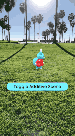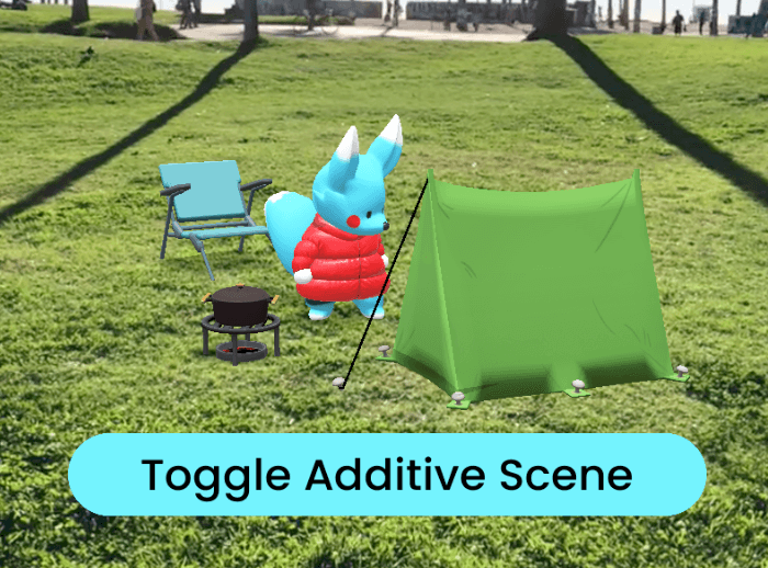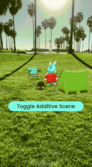 When you switch to the back camera, you'll see a blue button at the bottom of the Lens. Clicking on it loads the “Camping” scene around the fox, introduced as an additive scene. This is a practical way to showcase additive scenes: they add layers that enhance both the user experience and the story's depth.