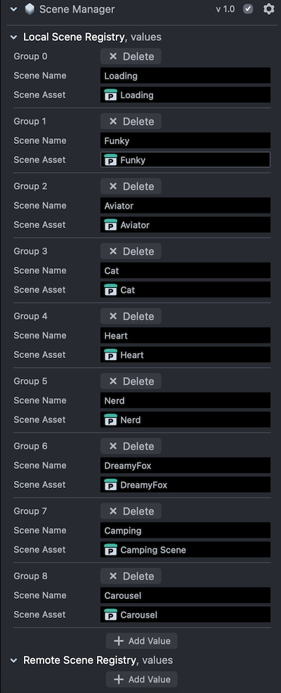 Utilizing remote assets as remote scenes is supported. However, since remote assets are per account, remote assets are not bundled within the default template. You are encouraged to integrate and test remote assets using the Remote Scene Registry listed below the Local Scene Registry.