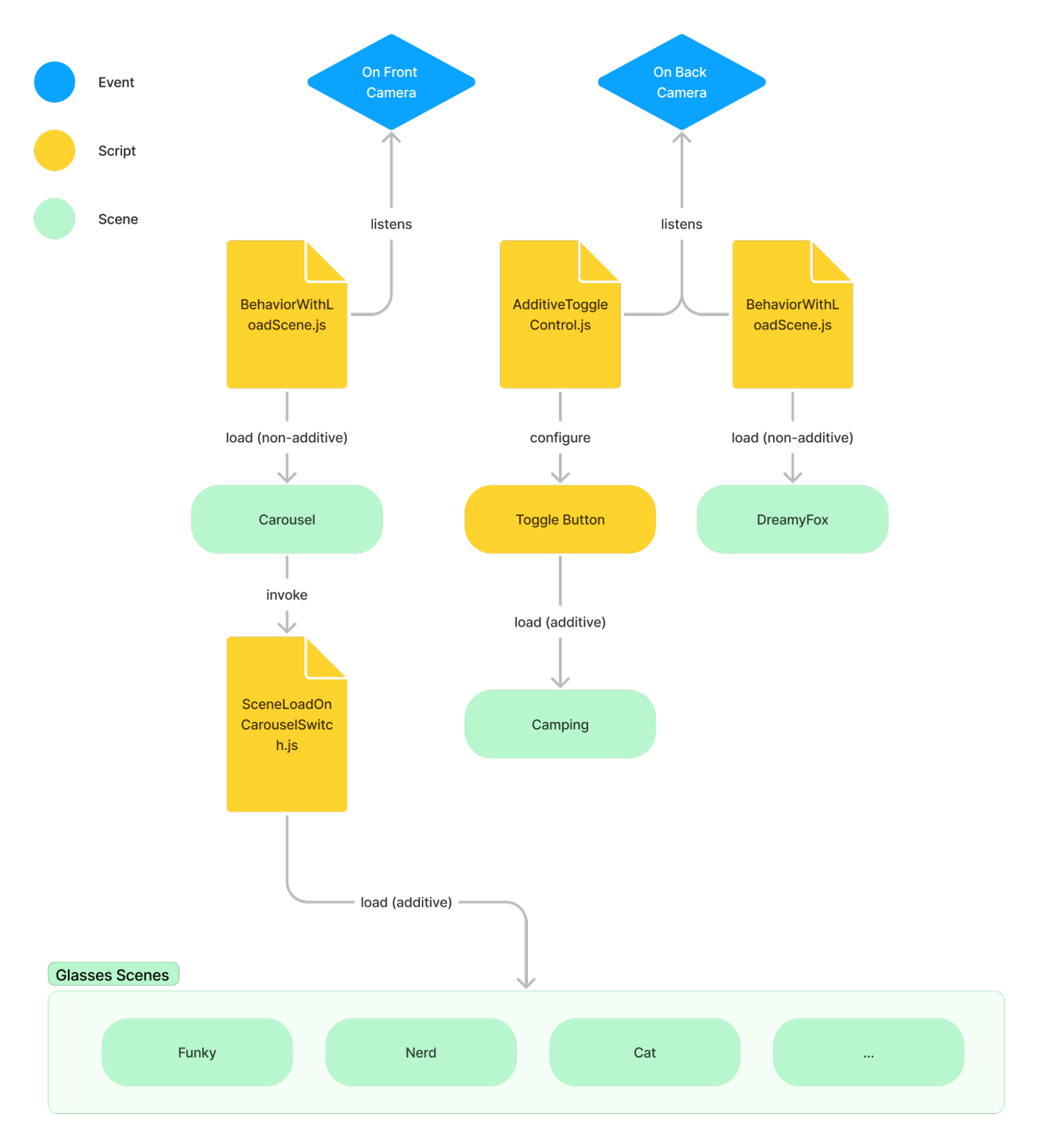 In the template, the glasses are loaded as additive scenes, the loading is called by the SceneLoadOnCarouselSwitch script, which listens to the Carousel component's item switch event and calls the Scene Manager to load the glasses onto the head of the user.