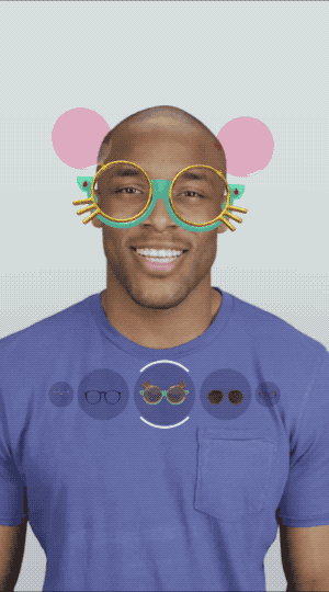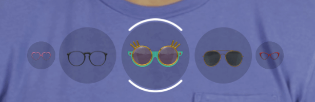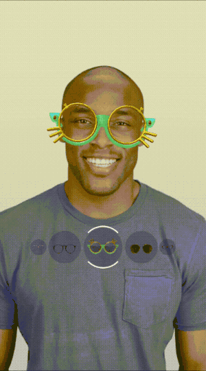- In the front Lens experience, glasses are shown on the user's face. The user can swipe through a carousel to change the glasses that they are trying on.
