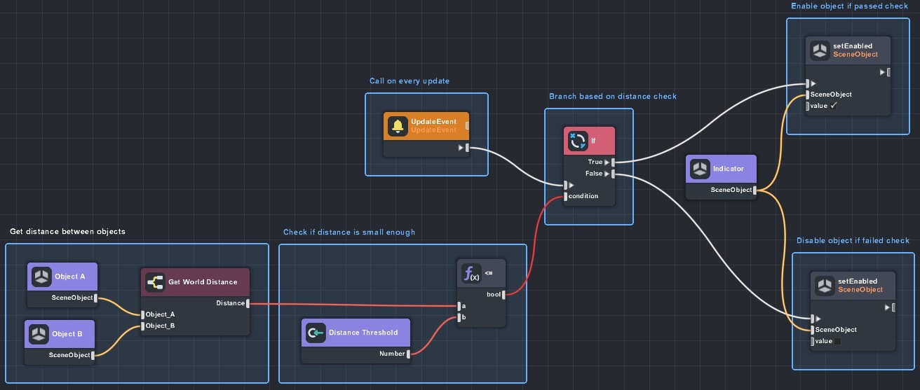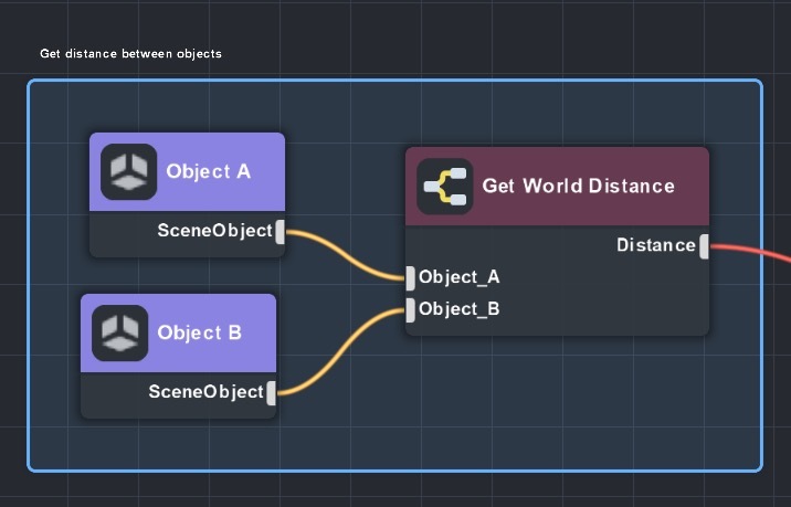 The Distance Check graph checks the distance between ObjectA and ObjectB with the GetWorldDistancenode. This node outputs a float which will be the value of the distance between ObjectA and ObjectB.