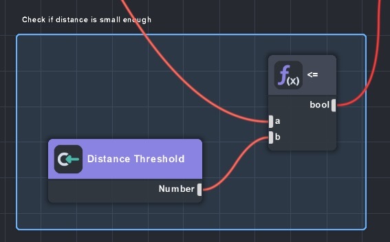 That value then gets sent to a node that compares number a and b and see if a is smaller or equals to b. It will send out a boolean value which will be true if a <= b, and false if a > b. In this case this boolean value will be true if ObjectA and ObjectB are closer than the Distance Threshold value, and false if they are further apart.
