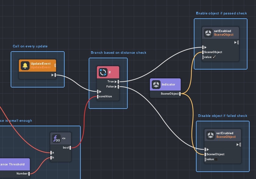 Then the boolean value will get passed to an if statement, and if the boolean value is true it will trigger the setEnabled node with default value of true so it will enable the Indicator object. If it is false, it will trigger the other setEnabled node with default value of false so it will disable the Indicator object.