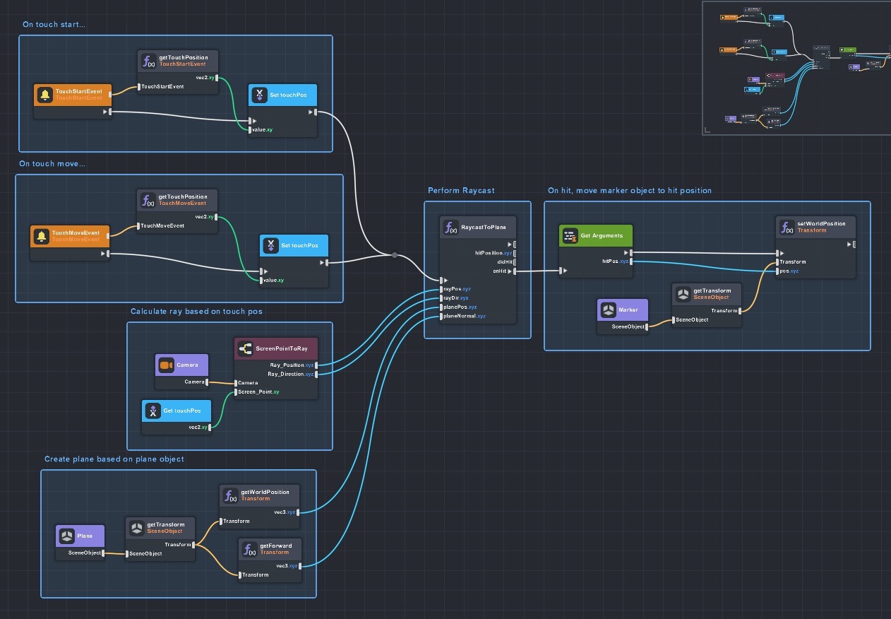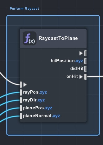 Then we’ll input all the variables we got earlier, the position and direction of the ray, and position and direction of the plane to the RaycastToPlane function node. We link this function node with our Touch events, so this function will be called whenever a touch event happens.
